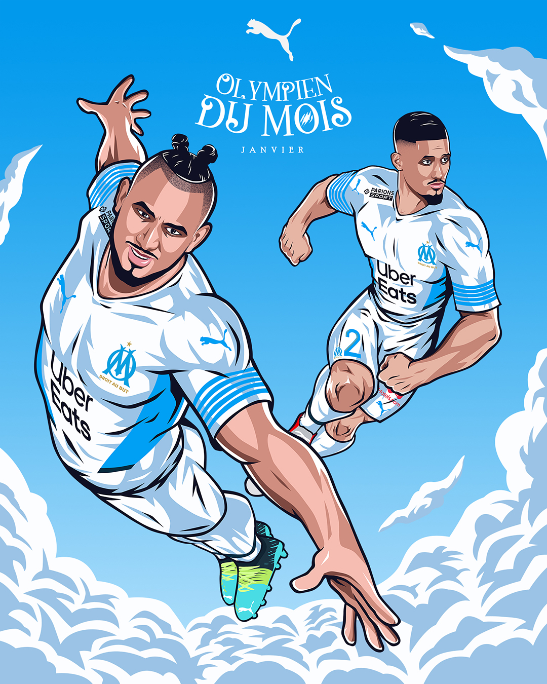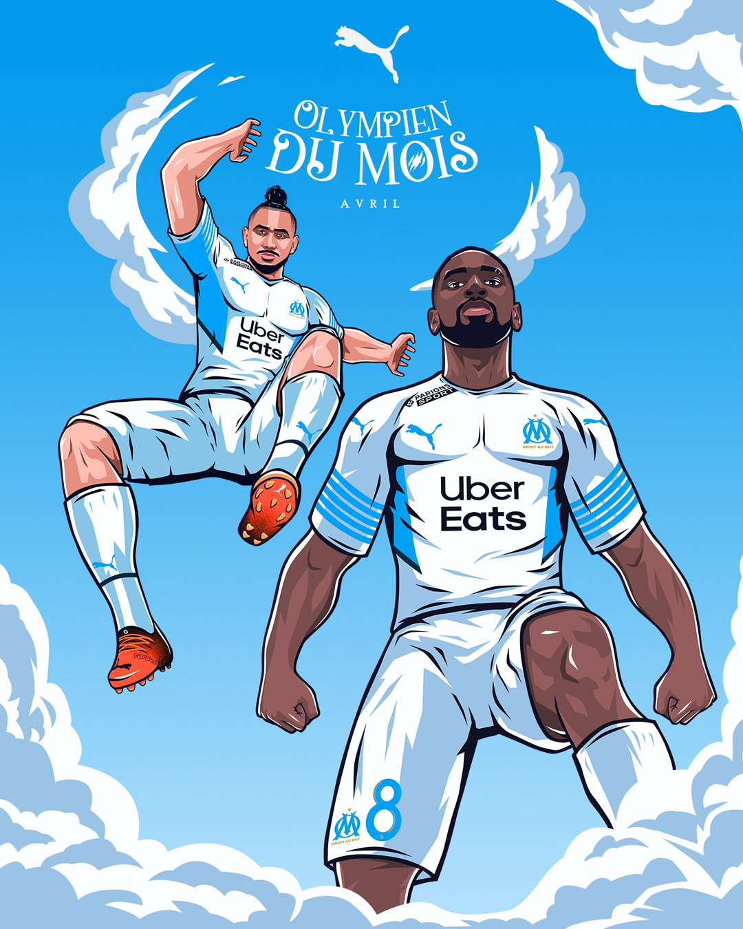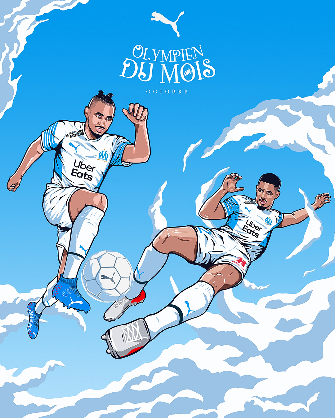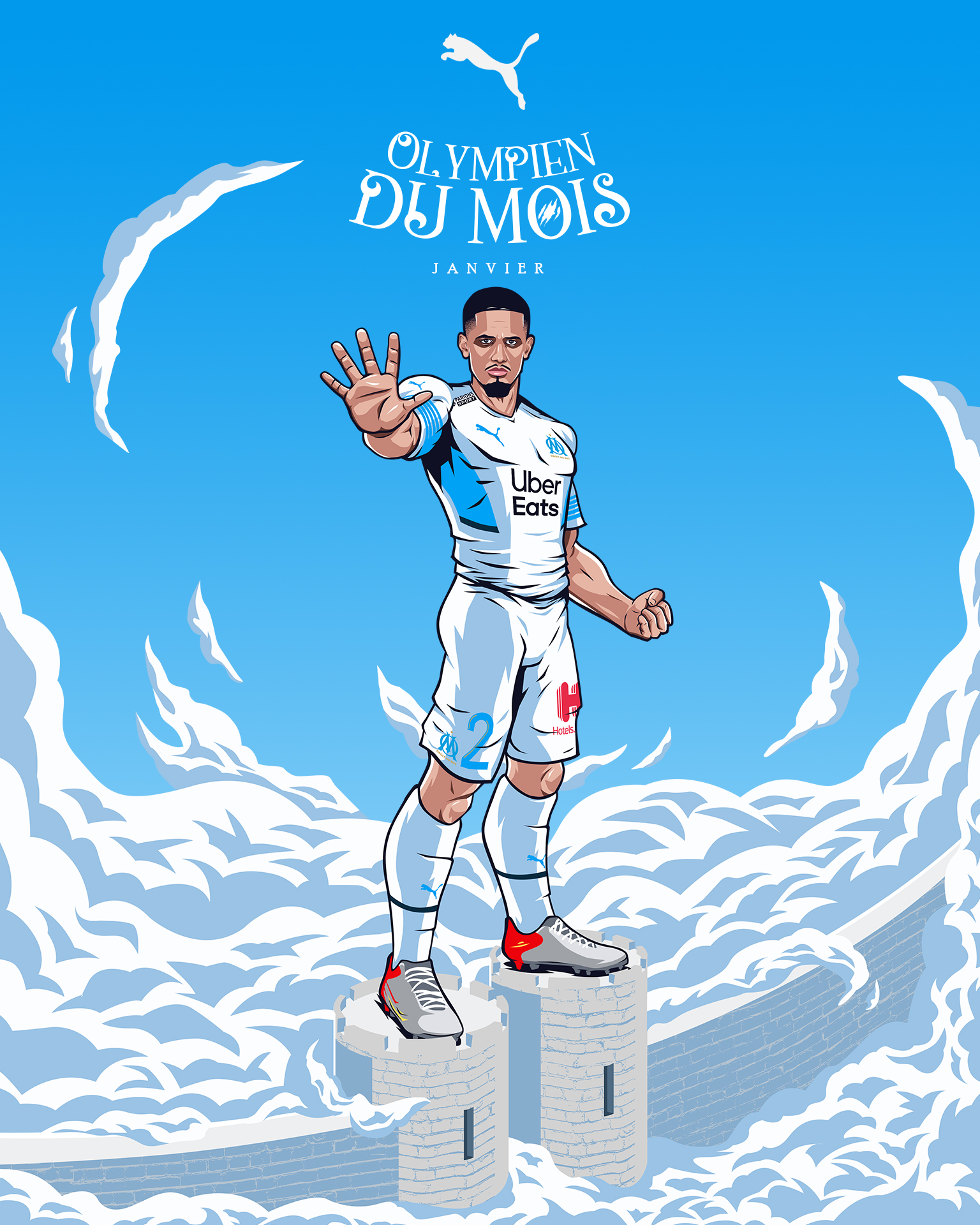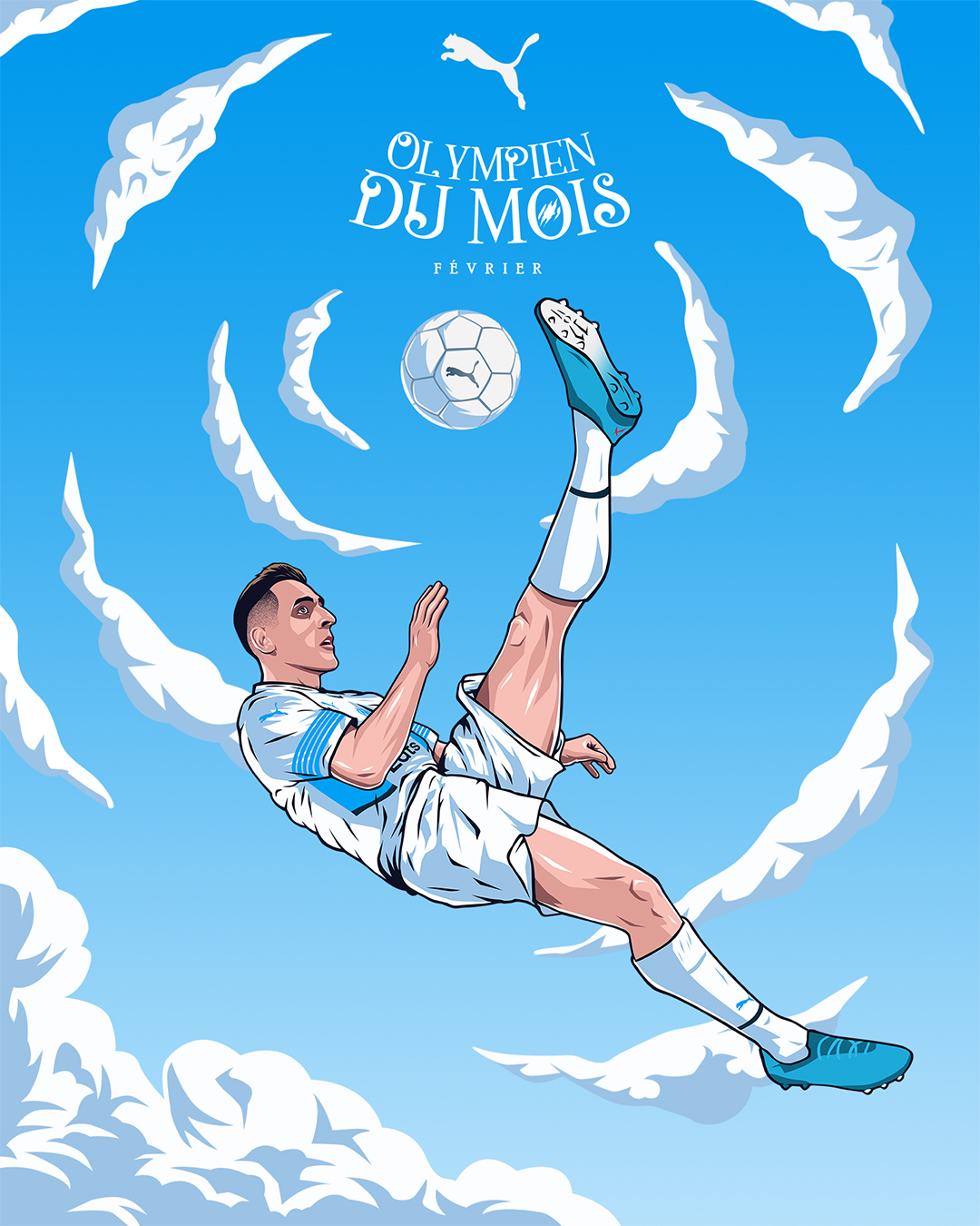 « L’Olympien du mois » est une activation portée par Puma, qui met chaque mois un joueur à l’honneur en célébrant ses performances exceptionnelles et son impact sur l’équipe. Le projet vise à renforcer le lien avec les supporters en mettant en avant les héros du quotidien du club. Pour la saison 2021/2022, nous avons réalisé les illustrations accompagnant le format « Olympien du mois ».